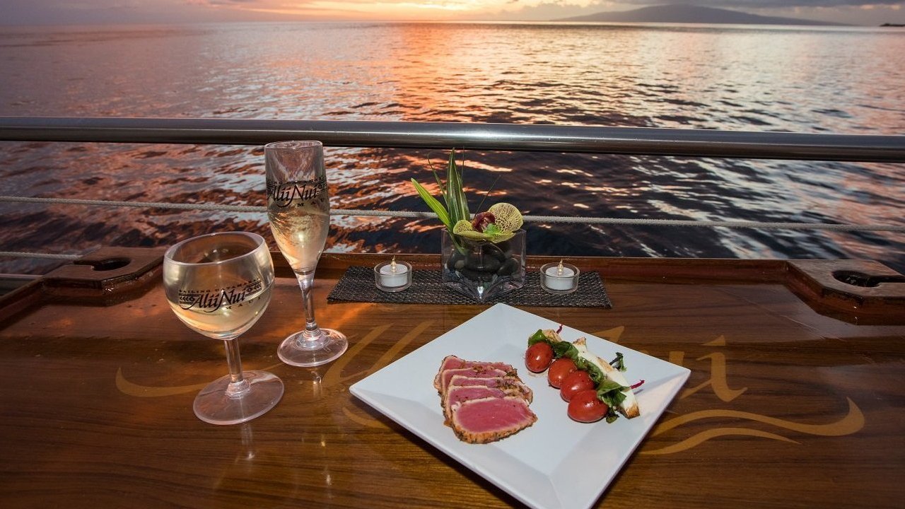 Ideal for guests looking for an upscale, adults-only, sunset dinner sail aboard a beautiful 65 ft, spacious sailing catamaran. Departing from the Ma'alaea Harbor, this luxury sunset sail experience offers a wide variety of delicious appetizers for guests to enjoy. One of the reasons why we enjoy this trip is the menu variety offered. The open bar includes top-shelf beverage options including beer, wine, champagne and mixed drinks throughout the trip with their crew taking care of you every step of the way. View more menu details and beverage option detail below. Truly one of the islands nicest boats and features ample space for guests to move around taking in all of the views of the West Maui Mountains, Haleakala, as well as the neighboring islands of Lanai, Kahoolawe and Molokini Crater. When conditions are ideal for sailing, the crew will raise the sail leading up to the sunset time.